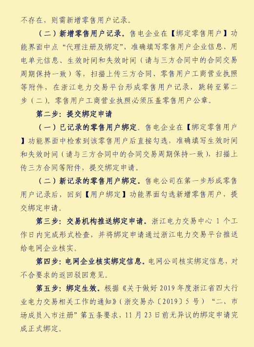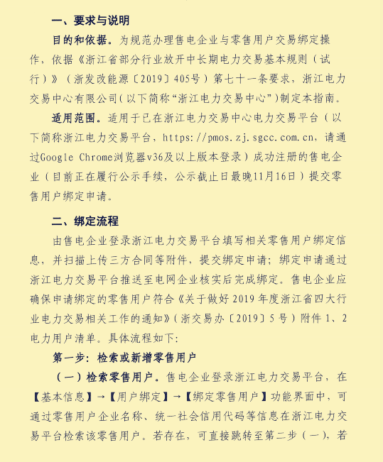 根據(jù)相關(guān)政策規(guī)定,售電公司必須綁定浙江電力交易平臺,目前具體的綁定說明和步驟流程已經(jīng)公示。根據(jù)公示內(nèi)容看,本次綁定的用戶主要是零售用戶交易形式的售電公司。