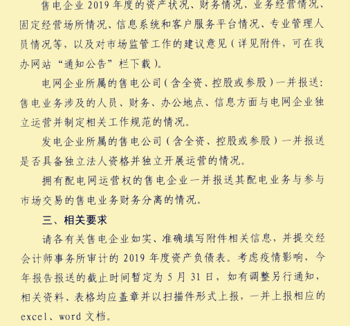 下面我們來看一下這份《關于開展售電企業(yè)持續(xù)滿足準入條件有關情況報告工作的通知》詳細內容: