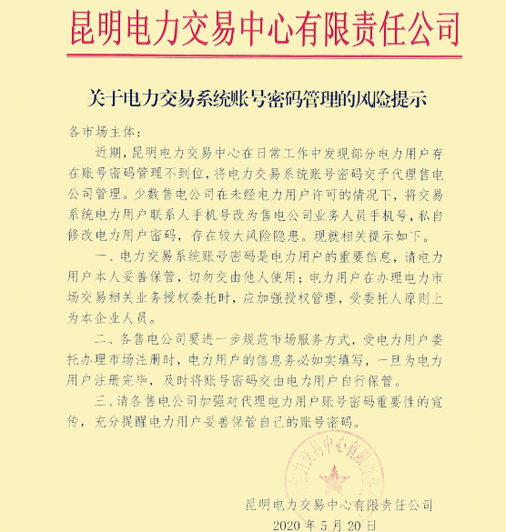 近幾日,昆明電力交易中心有限責(zé)任公司發(fā)布一一則關(guān)于管理教習(xí)系統(tǒng)賬號和密碼管理風(fēng)險提示,該通知的內(nèi)容是希望電力用戶可以很好的保管好電力系統(tǒng)賬號及密碼,不建議交給他人使用,而售電公司在接受電力用戶委托業(yè)務(wù),辦理市場注冊的時候,當(dāng)使用后,需要把賬號和密碼都交還給用戶。
