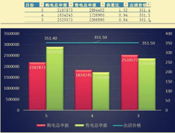 從上面陜西省電力交易中心給出的數(shù)據(jù)分析得出,5月份輸電車申報電量比售電側(cè)申報哦的電量多了不少,供求和需求的比為1.32,因此對買方市場比較有利,只要電價和預(yù)期相差不大,那么成交的幾率是很大的。